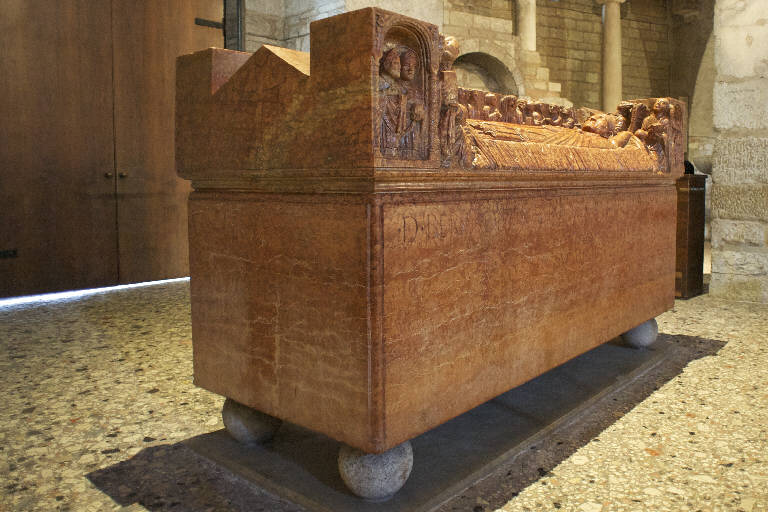 - NOTIZIE STORICO CRITICHE Da una cronoca cinquecentesca sappiamo che il monumento funebre di Berardo Maggi viene meso in opera nella cattedarale di S. Maria Assunta nel 1308 subito dopo la morte del vesco e signore della città. A curarne l'allestimento fu Matteo, fratello del defunto e suo successore al governo della città fra il 1308 e il 1311. E' probabile che l'arca sepolcrale fosse già stata preparata in precendenza e che lo stesso vescovo Maggi ne avesse elaborato il programma iconografico volto a celebrare la sua opera politica di "pacificatore" della città. A lui, infatti, si deve la fine delle lotte fra guelfi e ghibillini che insanguinarono Brescia nell'ultimo quarto del XIII secolo. In origine il monumento era collocato nell'arca presbiteriale dietro o a fianco dell'altare maggiore, era forse munito di baldacchino e sostenuto da mensole o leoni stilofori. Nel 1571 il sarcofago viene spostato e sistemato nella testata del transetto settentrionale della chiesa sopra la porta che conduceva verso l'antica cattedrale di S. Pietro de Dom. Nel 1986 il monumento viene trasferito nella sua collocazione attuale proprio di fronte al portale di ingresso. Unanimemente riconosciuto dai critici come un'opera di qualità estremament elevata sia per l'impiego del marmo rosso che nel Trecento era considerato un materiale di altissimo pregio, sia per i caratteri stilistici. Le scene figurate del coperchio si allontanano di molto dalla tradizione scultura duecentesca e introducono un linguaggio completamente nuovo fatto di grande vigore espressivo e di profonda umanità. Allo stato attuale delle conoscenze non è stata ancora individuata una personalità artisitca alla quale ricondurre l'opera; i critici sono, però, concordi nel definirne la personalità artistica che, da un lato, ben conosce l'operato dei maestri campionesi dai quali deriva tipologia e invenzione del monumento, dall'altro fa proprie le novità espressive e di resa naturalistica e narrativa della realtà elaborate dalla scultura veronese fra XIII e XIV secolo.
