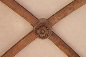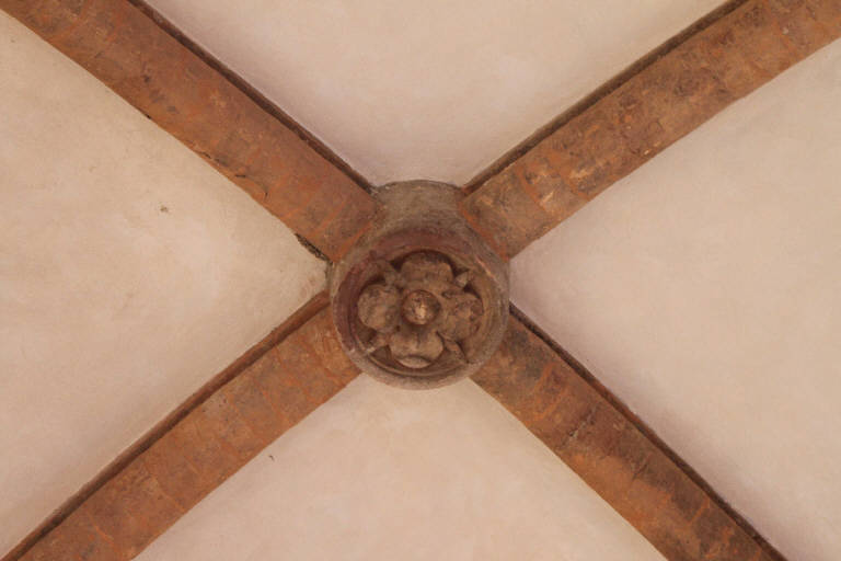 Chiave di volta a rilievo con profilo definito da un bordo modanato e rilevato e motivo decorativo floreale al centro.