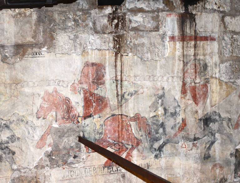 - NOTIZIE STORICO CRITICHE Il primo piano dell'ala meridionale del Broletto, che fu costruita nel secondo quarto del XIII secolo, era occupato da un salone molto grande dove si riuniva il Consiglio di Credenza della Città. Le dimensioni di questo spazio erano imponenti: era lungo quasi 52 metri, largo 14 metri e mezzo ed alto 9 m; era illuminato da grandi finestre polifore, il soffitto era a capriate lignee. Questo vasto ambiente restò in uso fino alla fine del XVI secolo quando fu suddiviso orizzontalmente: nella parte inferiore vennero create delle salette, in quella superiore, posta appena sotto il tetto, fu ricavata una soffitta adibita a vari usi fra cui quello di Archivio Storico Civico. Tra il 1944 e il 1946 i documenti e i materiali dell'Archivio Storico Civico vennero spostati e sulle pareti settentrionale e meridionale del sottotetto fu scoperta una decorazione ad affresco piuttosto vasta che, in epoca medievale, ornava le pareti del Salone del Consiglio della Città di Brescia. Nel 1946 i dipinti sono stati discialbati, ripuliti e consolidati dal restauratore Bertelli che mette in luce due strati sovrapposti di affreschi. Il primo, pertinente alla seconda metà del XIII secolo, raffigura una teoria di cavalieri incatenati che escono dalle porte della città facendo riferimento ai diversi provvedimenti presi dal Comune bresciano per allontanare i nobili di parte ghibellina della città nell'ultimo quarto del XIII secolo. Il secondo strato della decorazione pittorica, invece, è databile a qualche decennio più tardi e comprende la raffigurazione della cosiddetta "Pace di Bagnolo Mella" che, nel 1298, pose fine alle lotte civili fra guelfi e ghibellini stabilendo su Brescia la signoria del Vescovo Berardo Maggi e vari dipinti di soggetto sacro che, nel 1946, vennero strappati dalle pareti per mettere in luce la sfilata dei cavalieri ed oggi sono conservati nella Pinacoteca Civica.