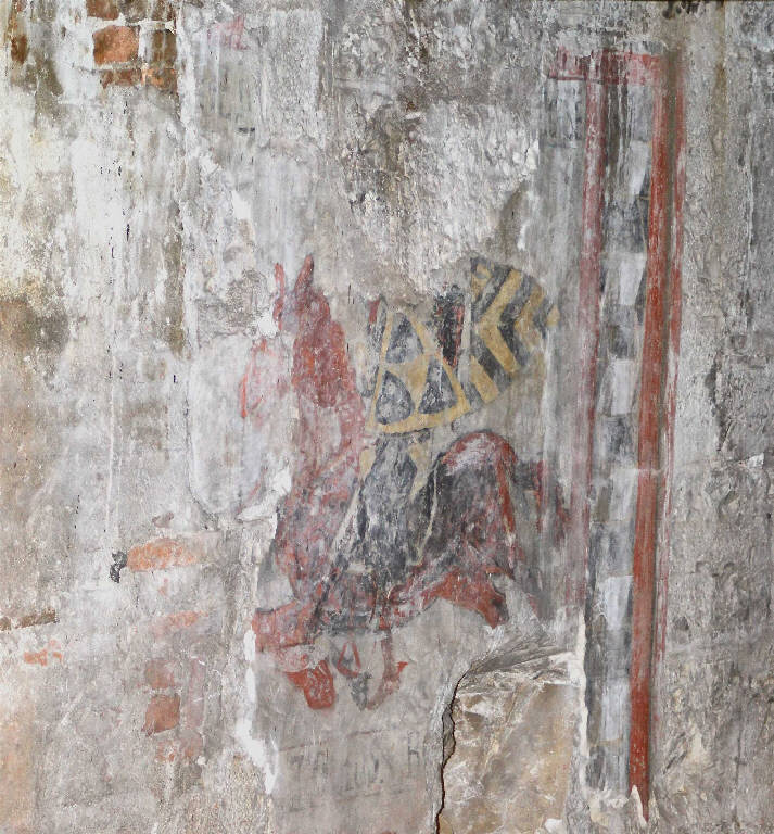 - NOTIZIE STORICO CRITICHE Il primo piano dell'ala meridionale del Broletto, che fu costruita nel secondo quarto del XIII secolo, era occupato da un salone molto grande dove si riuniva il Consiglio di Credenza della Città. Le dimensioni di questo spazio erano imponenti: era lungo quasi 52 metri, largo 14 metri e mezzo ed alto 9 m; era illuminato da grandi finestre polifore, il soffitto era a capriate lignee. Questo vasto ambiente restò in uso fino alla fine del XVI secolo quando fu suddiviso orizzontalmente: nella parte inferiore vennero create delle salette, in quella superiore, posta appena sotto il tetto, fu ricavata una soffitta adibita a vari usi fra cui quello di Archivio Storico Civico. Tra il 1944 e il 1946 i documenti e i materiali dell'Archivio Storico Civico vennero spostati e sulle pareti settentrionale e meridionale del sottotetto fu scoperta una decorazione ad affresco piuttosto vasta che, in epoca medievale, ornava le pareti del Salone del Consiglio della Città di Brescia. Nel 1946 i dipinti sono stati discialbati, ripuliti e consolidati dal restauratore Bertelli che mette in luce due strati sovrapposti di affreschi. Il primo, pertinente alla seconda metà del XIII secolo, raffigura una teoria di cavalieri incatenati che escono dalle porte della città facendo riferimento ai diversi provvedimenti presi dal Comune bresciano per allontanare i nobili di parte ghibellina della città nell'ultimo quarto del XIII secolo. Il secondo strato della decorazione pittorica, invece, è databile a qualche decennio più tardi e comprende la raffigurazione della cosiddetta "Pace di Bagnolo Mella" che, nel 1298, pose fine alle lotte civili fra guelfi e ghibellini stabilendo su Brescia la signoria del Vescovo Berardo Maggi e vari dipinti di soggetto sacro che, nel 1946, vennero strappati dalle pareti per mettere in luce la sfilata dei cavalieri ed oggi sono conservati nella Pinacoteca Civica.