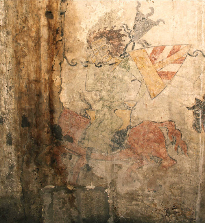 - NOTIZIE STORICO CRITICHE Il primo piano dell'ala meridionale del Broletto, che fu costruita nel secondo quarto del XIII secolo, era occupato da un salone molto grande dove si riuniva il Consiglio di Credenza della Città. Le dimensioni di questo spazio erano imponenti: era lungo quasi 52 metri, largo 14 metri e mezzo ed alto 9 m; era illuminato da grandi finestre polifore, il soffitto era a capriate lignee. Questo vasto ambiente restò in uso fino alla fine del XVI secolo quando fu suddiviso orizzontalmente: nella parte inferiore vennero create delle salette, in quella superiore, posta appena sotto il tetto, fu ricavata una soffitta adibita a vari usi fra cui quello di Archivio Storico Civico. Tra il 1944 e il 1946 i documenti e i materiali dell'Archivio Storico Civico vennero spostati e sulle pareti settentrionale e meridionale del sottotetto fu scoperta una decorazione ad affresco piuttosto vasta che, in epoca medievale, ornava le pareti del Salone del Consiglio della Città di Brescia. Nel 1946 i dipinti sono stati discialbati, ripuliti e consolidati dal restauratore Bertelli che mette in luce due strati sovrapposti di affreschi. Il primo, pertinente alla seconda metà del XIII secolo, raffigura una teoria di cavalieri incatenati che escono dalle porte della città facendo riferimento ai diversi provvedimenti presi dal Comune bresciano per allontanare i nobili di parte ghibellina della città nell'ultimo quarto del XIII secolo. Il secondo strato della decorazione pittorica, invece, è databile a qualche decennio più tardi e comprende la raffigurazione della cosiddetta "Pace di Bagnolo Mella" che, nel 1298, pose fine alle lotte civili fra guelfi e ghibellini stabilendo su Brescia la signoria del Vescovo Berardo Maggi e vari dipinti di soggetto sacro che, nel 1946, vennero strappati dalle pareti per mettere in luce la sfilata dei cavalieri ed oggi sono conservati nella Pinacoteca Civica.