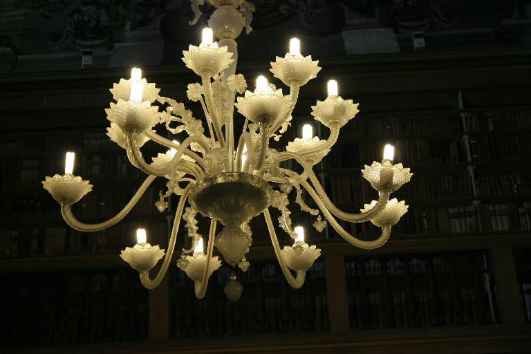Lampadario in vetro di Murano costituito da una coppa, con pendenti a motivo floreale, da cui si dipartono, a raggiera, venti bracci ramiformi. Lo stelo presenta nella parte centrale un nodo a sezione circolare.