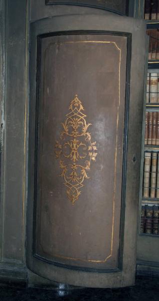 Sportello concavo con serratura che nasconde la scala elicoidale per l'accesso alle scansie superiori della libreria nel salone. L'elemento ligneo presenta una decorazione a tempera con motivo decorativo dorato al centro ed è fissato allo stipie tramite due cerniere metalliche.