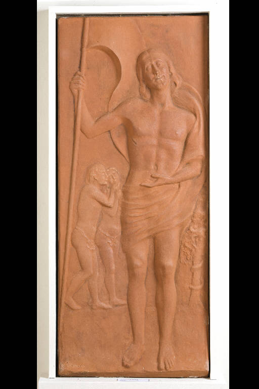 Bassorilievo in gesso tinto cocciopesto (simula l'effetto visivo della terracotta)
