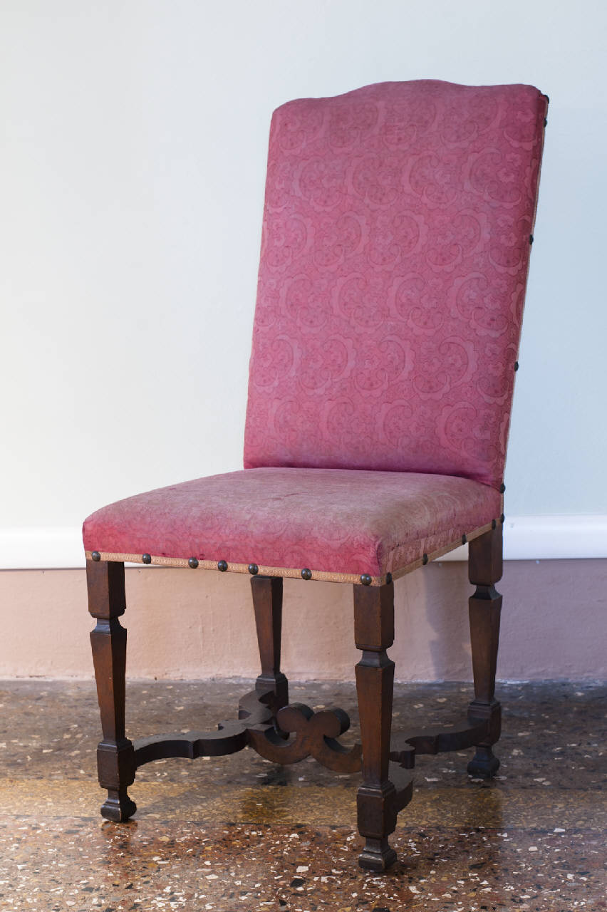 - NOTIZIE STORICO CRITICHE Il modello delle sedie in esame è in linea con il gusto Barocchetto diffuso nell'ambito lombardo-veneto all'inizio del Settecento. Confermano la datazione la forma slanciata dei sostegni a forma tronco-piramidale, in stile pienamente "Luigi XIV", appesentita verso la base da elementi a dado nei quali si innestano una sinuosa traversa e l'alto schienale rettangolare, rigido e poco inclinato, mosso solo superiormente da una leggera curvatura e delimitato da due guide, completamente coperte da una sottile imbottitura, che risultano essere il prolungamento delle gambe posteriori. Sedile e schienale sono ricoperti da un tessuto non originale, databile alla prima metà del XX secolo. Fanno parte del legato del conte Tadini del 1828.