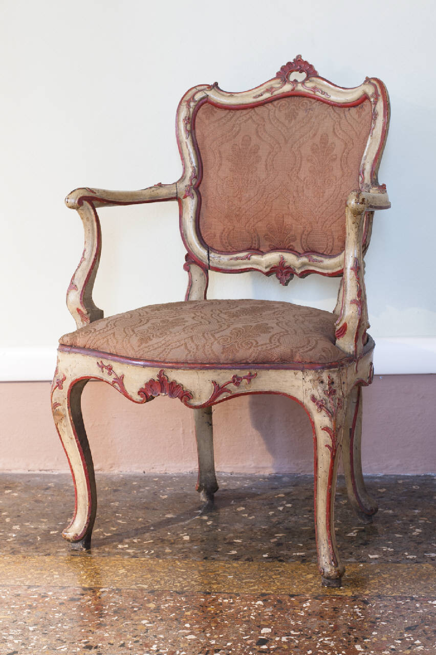 Serie di sei poltrone in legno laccato. Gambe "en cabriole" incurvate a "S" in stile rococò sorrette da uno zoccoletto. Grembiale ondulato decorato ad intaglio con motivi rocailles. Braccioli terminanti a ricciolo arretrati rispetto al sedile con sostegni curvilinei. Schienale con cornice sagomata decorata ad intaglio nella cimasa con motivi rocailles. Sedile e schienale imbottiti rivestiti in tessuto di cotone rosso operato.