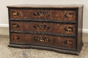 Cassettone in legno di noce intarsiato. Base modanata poggiante direttamente a terra. I tre cassetti di uguale altezza sono contornati da una piccola cornice sporgente e separati uno dall'altro da una sottile fascia. Sulla fronte mistilinea di ciascun cassetto è intarsiata in noce e madreperla una decorazione chiara su fondo scuro incorniciata da una impiallacciatura in noce. Il soggetto, diverso per tutti e tre i cassetti, è formato da animali e figure femminili e maschili circondate da motivi vegetali. I fianchi e il piano sono anch'essi intarsiati.