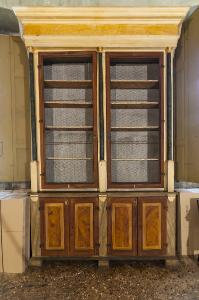 - NOTIZIE STORICO CRITICHE Si ipotizza che il manufatto in esame, che si accompagna ad altri armadi libreria sempre collocati in biblioteca (nn. inv. Mobili M177-M178 e M180), sia stato appositamente realizzato per arredare la stanza e quindi eseguito, probabilmente da una bottega locale, tra 1824 ca., anno di conclusione dei lavori al palazzo, e prima del 1829, anno di apertura al pubblico dell'Accademia. Le colonnine con capitello e base in legno dorato presenti nel corpo superiore, tipiche dello stile "Impero", sono state applicate in un secondo momento.