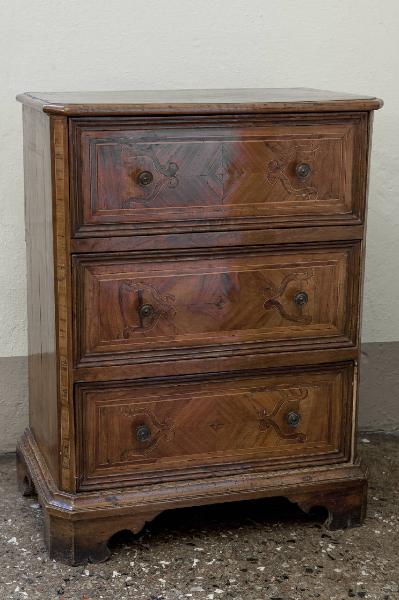 Coppia di mobili in legno di noce lastronato. Base modanata poggiante a terra per mezzo di piedini a mensola dal profilo sagomato. Fronte occupato da tre cassetti di uguale altezza, contornati da una piccola cornice modanata, decorati con riccioli e motivi romboidali. Fianchi lisci. Piano aggettante con angoli smussati. Ogni cassetto è provvisto di una coppia di maniglie circolari in metallo dorato.