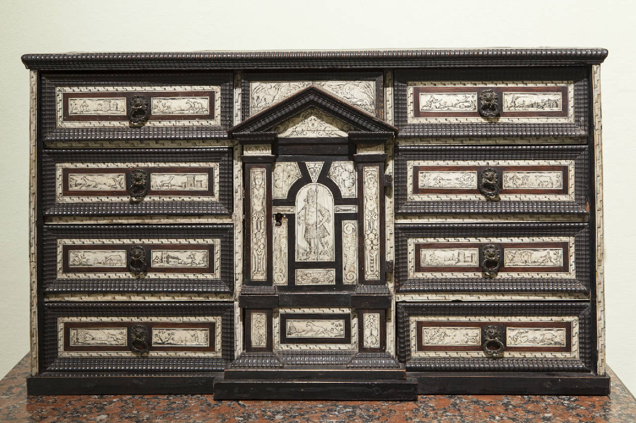 Stipo in legno verniciato con parti in avorio inciso e ageminato, terminante con piano orizzontale modanato aggettante. Base modanata. Fronte scandita da otto cassetti (quattro per lato) decorati con formelle in avorio inciso e ageminato raffiguranti vedute campestri; al centro una struttura architettonica con lesene e timpano in avorio decorati da grottesche, animali, cariatidi, festoni e motivi vegetali. Sullo sportello centrale è raffigurato un soldato con lancia. Maniglie con testa leonina realizzate in bronzo fuso.