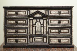 - NOTIZIE STORICO CRITICHE Nel Seicento continuò la produzione, iniziata nel corso del XVI secolo, di stipi pregiati intarsiati in avorio, tartaruga e altri materiali preziosi che assunsero strutture architettoniche imponenti come quello in esame. Alla loro costruzione altamente differenziata concorrevano squadre di artisti di diversa specializzazione, che sinergicamente si interfacciavano per comporre all'unisono un manufatto che in sé condensava la più rilevante espressione della magnificenza barocca.\nL'avorio fu usato sin dai tempi più remoti, grazie alla sua resistenza, per la costruzione di oggetti ornamentali e di utilità pratica. Il gusto e lo stile della sua lavorazione si svilupparono nel periodo gotico; note furono le sculture a tutto tondo di immagini sacre. La produzione di polittici erbunei fu molto diffusa in Germania, Francia e nelle Fiandre. Se nel '400 italiano l'avorio fu usato a Firenze e a Venezia per la produzione di raffinati cofanetti, dittici, trittici e altaroli per uso sacro e profano, nel Seicento venne impiegato per la preparazione di vasi, trionfi da tavolo, boccali lavorati a tornio, cornici, piatti, candelabri, strumenti scientifici e nella lavorazione dei mobili. Nel Settecento venne spesso impiegato con la madreperla per applicazioni a intarsio in vassoi, suppellettili e mobili. Nell'Ottocento la lavorazione artigianale dell'avorio decadde sino ad essere soppiantata nel nostro secolo da prodotti sintetici che ne imitano colore, resistenza ed elasticità.\nLo stipo fa parte del legato Francesco Zitti del 1953.