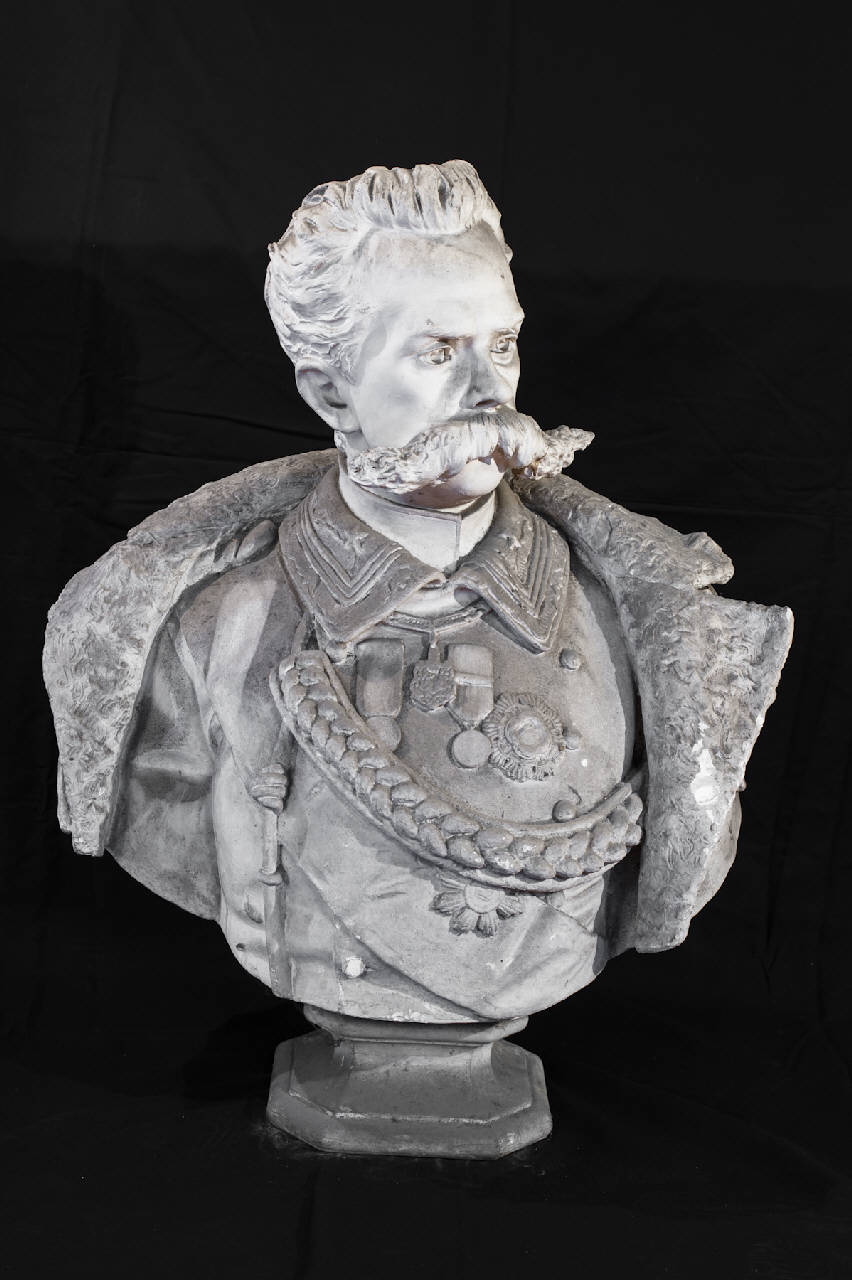 - NOTIZIE STORICO CRITICHE Si ipotizza che il manufatto in esame sia un modello in gesso realizzato nell'ultimo quarto dell'Ottocento. Infatti in quegli anni a Lovere vennero eretti numerosi monumenti celebrativi dell'epopea risorgimentale. Nel corso del XIX secolo la lavorazione del gesso assunse un importante valore storico ed artistico in quanto consentiva di esprimere, grazie alla sua straordinaria plasticità, maggiore espressività e storicizzazione.\nLa scultura raffigura il busto del re Umberto I in alta uniforme. \nPresso il Museo del Risorgimento sono presenti altri busti in gesso raffiguranti personaggi del Risorgimento italiano (cfr. nn. inv. Museo del Risorgimento MRS10 "Busto di Giuseppe Garibaldi"; MRS11 "Busto del re Vittorio Emanuele II"; MRS12 "Busto di Giuseppe Mazzini"; MRS13 "Busto di Camillo Benso conte di Cavour"; MRS017 "Busto di Vittore Tasca" e MRS18 "Busto di Giovanni Battista Camozzi".\nLa scultura fa parte della collezione di Giovanni Battista Zitti raccolta nelle sale della villa "Caprera" a Bossico donata all'Accademia Tadini dalla cognata Teresa Banzolini Storti nel 1915.