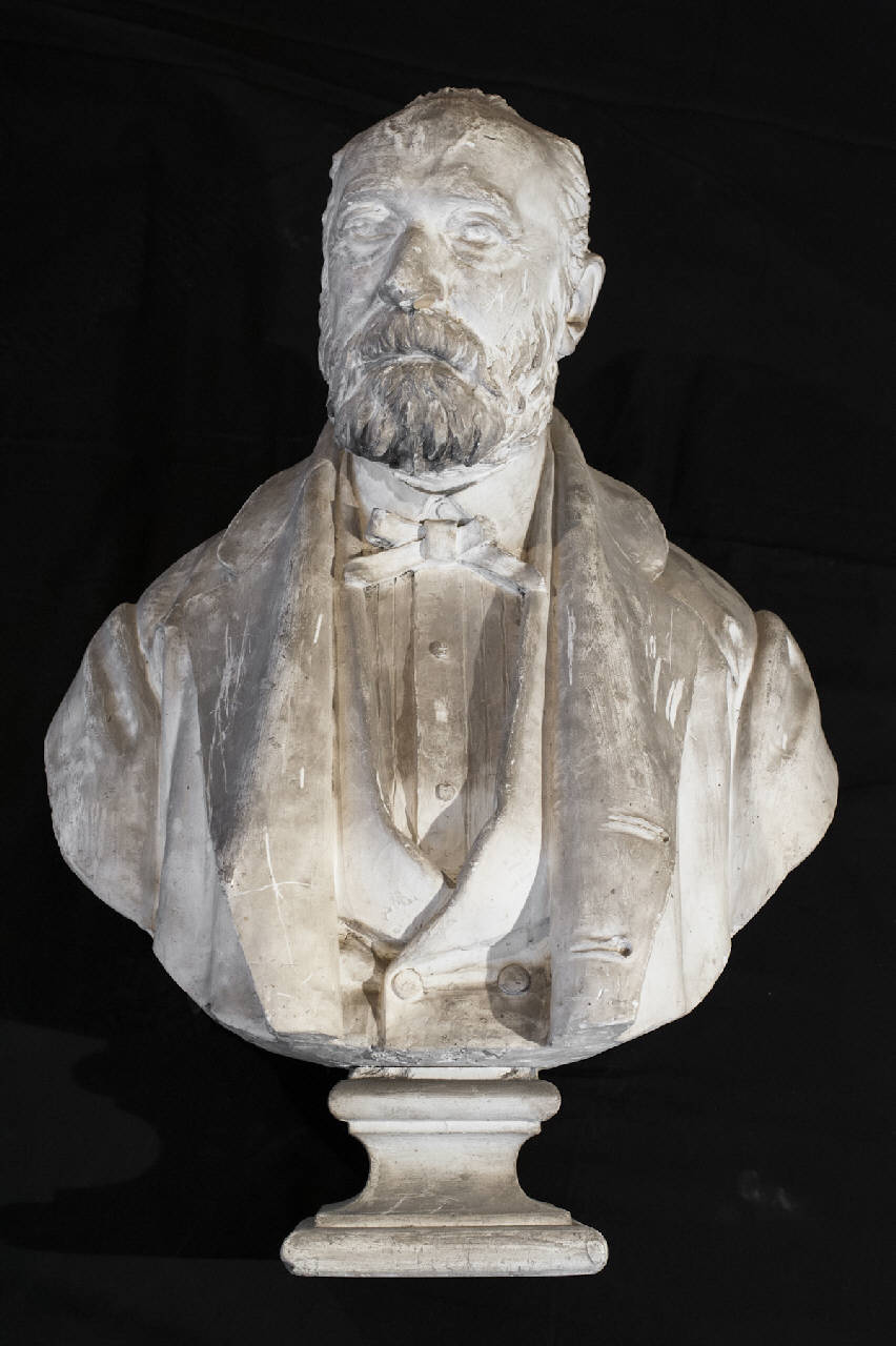- NOTIZIE STORICO CRITICHE Si ipotizza che il manufatto in esame sia un modello in gesso riferibile alla produzione di tardo Ottocento di Giulio Branca.\nLo scultore, che fu avviato all'arte dal cannobiese Bergonzoli, frequentò all'Accademia di Brera la scuola di nudo e quella di scultura di G. Strazza. Esordì con uno stile neoclassico ma ben presto si concentrò sul filone della grande scultura romantica, trattata però con un'attenzione veristica, per giungere ad uno stile simbolista a sfondo sociale. Si calcolano circa quattrocento opere tra monumenti commemorativi, monumenti funerari e bustiritratto (forse il suo filone più solido).\nIl busto in esame ritrae, in modo veristico e con un'elevatissima cura nella resa dei particolari, Giovanni Battista Camozzi (1818-1906), primo sindaco di Bergamo dopo l'Unità d'Italia (tra il 1860 e il 1870). Insieme al fratello Gabriele partecipò alle prime due guerre d'indipendenza italiane e fu senatore del Regno d'Italia. \nPresso il Museo del Risorgimento sono presenti altri busti in gesso raffiguranti personaggi del Risorgimento italiano (cfr. nn. inv. Museo del Risorgimento MRS10 "Busto di Giuseppe Garibaldi"; MRS11 "Busto del re Vittorio Emanuele II"; MRS12 "Busto di Giuseppe Mazzini"; MRS13 "Busto di Camillo Benso conte di Cavour"; MRS14 "Busto del re Umberto I"; MRS15 "Busto di Gabriele Rosa" e MS17 "Busto di Vittore Tasca").\nLa scultura fa parte della collezione di Giovanni Battista Zitti raccolta nelle sale della villa "Caprera" a Bossico donata all'Accademia Tadini dalla cognata Teresa Banzolini Storti nel 1915.