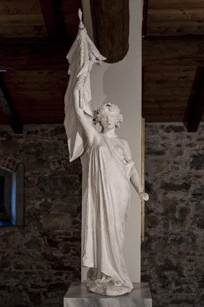 - NOTIZIE STORICO CRITICHE Si tratta del bozzetto in gesso raffigurante la statua della Libertà del monumento in Piazza Tredici Martiri eseguito dal milanese Giacomo Sozzi nel 1881. La scultura, ritrovata nei depositi dell'Accademia Tadini, è stata restaurata da Cinzia Parnigoni. Il monumento della piazza fu realizzato grazie al notaio Enrico Banzoli (1817-1874) che nel 1848 fu tra i difensori di Marghera. Banzoli lasciò un legato di lire 10 mila previsto nel testamento del 1867 per innalzare un monumento ai caduti delle battaglie risorgimentali. Il progetto, firmato e datato 1881, fu disegnato da Giuliano Volpi (1838-1913) ed eseguito dallo scultore Giacomo Sozzi. Pertanto si ipotizza che il bozzetto sia stato eseguito dopo la realizzazione del disegno ma sicuramente prima del manufatto finale. Di Giacomo Sozzi si sa poco, sue sono la statua di San Vigilio nella parrocchiale di S. Andrea ad Iseo, eseguita nel 1874, e le sculture che decorano il basamento dei monumenti al conte Tadini e a Vittorio Emanuele II a Lovere.\nIl manufatto risulta presente in Accademia Tadini già dal 1915, come conferma l'inventario redatto in quell'anno.