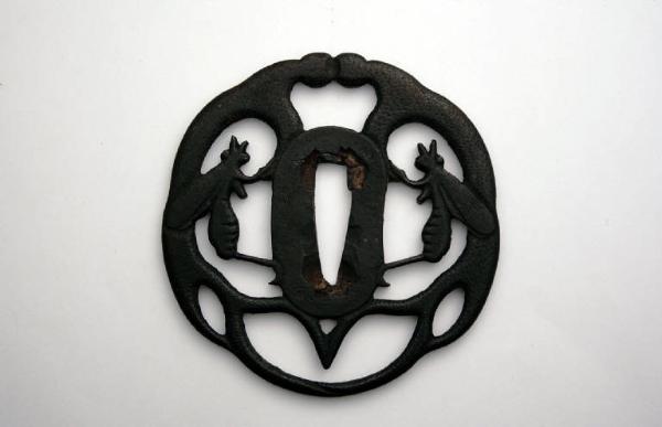 Elsa di spada giapponese di forma quadrilobata (mokkogata), con i tre fori canonici, quello centrale (nakagoana) per il codolo, il foro di sinistra (kozuka hitsuana) per il coltellino, e quello di destra (kogai hitsuana) per lo spillone. Sono raffigurati due api affrontate.