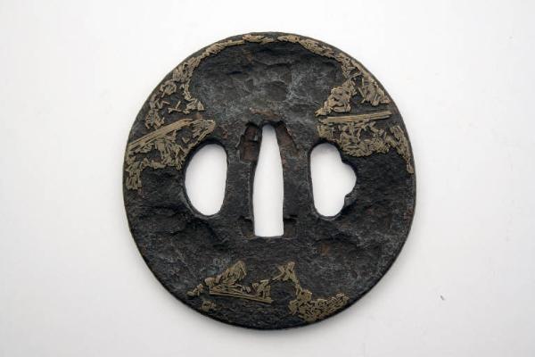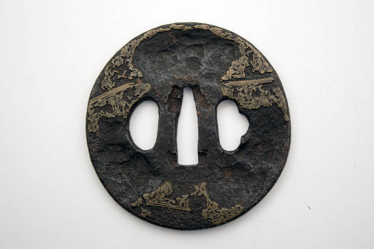 - NOTIZIE STORICO CRITICHE In Giappone l'elsa è detta "tsuba". La sua funzione primaria è quella di fare in modo che la mano di chi impugna la spada non finisca sulla propria lama, oltre a bilanciare la spada e a proteggere la mano dalla lama dell'avversario.\nIndirettamente, gli tsuba servivano anche a mostrare lo stato sociale e il gusto personale e, come per altri oggetti d'uso, divennero presto un mezzo d'espressione artistica.\nDal XIX secolo, quando la spada e i suoi accessori divennero più decorativi che funzionali, e ancor più dal 1878, a seguito della proibizione di portare la spada, gli tsuba erano prodotti come oggetti da collezione favoriti dagli occidentali, che li vedevano come una originale e nuova forma d'arte. Molti di questi oggetti raggiunsero infatti l'Europa già nell'Ottocento.\n\nI fori laterali, hitsuana servivano a lasciare passare i manici dei piccoli oggetti decorativi e d'uso che sporgevano dal fodero.\n\nGli inserti sparsi di segmenti di rame e ottone sono tipici dello stile Heianjo dell'inizio di periodo Edo.
