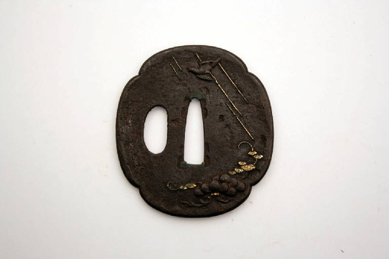 Elsa di spada giapponese di forma quadrilobata (mokkogata), con bordo leggermente rialzato. Sono presenti il foro centrale per il codolo (nakagoana) e il foro di sinistra (kozuka hitsuana). \nLa decorazione è' realizzata con intarsi in oro e rappresenta un uccello che vola durante un giorno di pioggia. Il verso presenta due montagne con una cascata al centro.