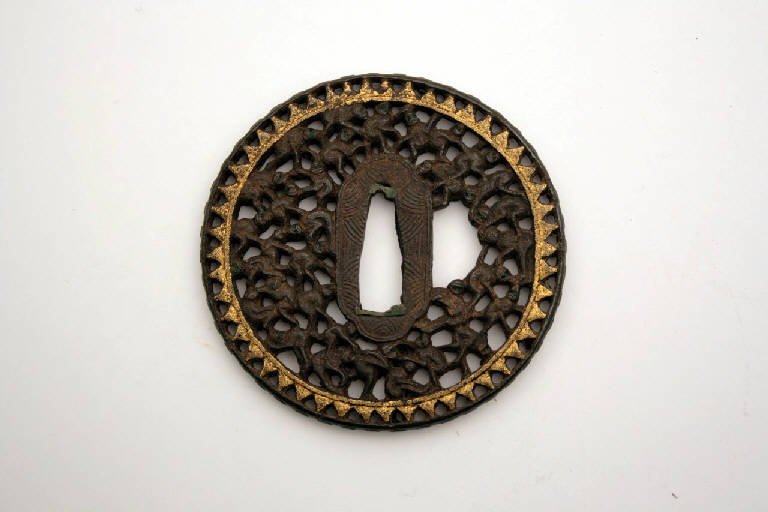 - NOTIZIE STORICO CRITICHE In Giappone l'elsa è detta "tsuba". La sua funzione primaria è quella di fare in modo che la mano di chi impugna la spada non finisca sulla propria lama, oltre a bilanciare la spada e a proteggere la mano dalla lama dell'avversario.\nIndirettamente, gli tsuba servivano anche a mostrare lo stato sociale e il gusto personale e, come per altri oggetti d'uso, divennero presto un mezzo d'espressione artistica.\nDal XIX secolo, quando la spada e i suoi accessori divennero più decorativi che funzionali, e ancor più dal 1878, a seguito della proibizione di portare la spada, gli tsuba erano prodotti come oggetti da collezione favoriti dagli occidentali, che li vedevano come una originale e nuova forma d'arte. Molti di questi oggetti raggiunsero infatti l'Europa già nell'Ottocento.\n\nDegli spessori di rame sono stati applicati ai vertici del nakagoana per fermare perfettamente l'elsa sulla lama.\n\nIl motivo delle 1000 scimmie veniva spesso utilizzato dagli artisti Mitsuhiro I e Mitsuhiro II, che hanno vissuto nella provincia di Hizen all'inizio del XIX secolo. La scimmia ha il ruolo di messaggero delle divinità shintoiste e buddiste con il mondo umano.\n\nQuesti tsuba, influenzati dallo stile cinese, sono chiamati namban (lett. barbari del sud) tsuba.