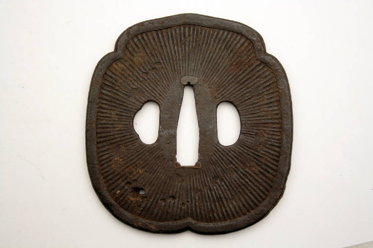 Elsa di spada giapponese con profilo "a forma di pesca", momo gata, con bordo che si ripiega sulla superficie, e con i tre fori canonici, quello centrale (nakagoana) per il codolo, il foro di sinistra (kozuka hitsuana) per il coltellino, e quello di destra (kogai hitsuana) per lo spillone. Incisione leggera della superficie a linee che partono dal centro dell'elsa (yasurime).