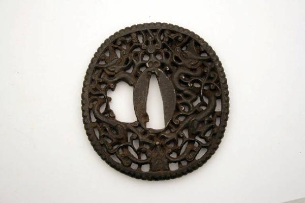 - NOTIZIE STORICO CRITICHE In Giappone l'elsa è detta "tsuba". La sua funzione primaria è quella di fare in modo che la mano di chi impugna la spada non finisca sulla propria lama, oltre a bilanciare la spada e a proteggere la mano dalla lama dell'avversario.\nIndirettamente, gli tsuba servivano anche a mostrare lo stato sociale e il gusto personale e, come per altri oggetti d'uso, divennero presto un mezzo d'espressione artistica.\nDal XIX secolo, quando la spada e i suoi accessori divennero più decorativi che funzionali, e ancor più dal 1878, a seguito della proibizione di portare la spada, gli tsuba erano prodotti come oggetti da collezione favoriti dagli occidentali, che li vedevano come una originale e nuova forma d'arte. Molti di questi oggetti raggiunsero infatti l'Europa già nell'Ottocento.\n\nQuesto tipo di rappresentazione è associate alle namban tsuba, prodotte dal XVII secolo, un periodo segnato dall'arrivo dei primi mercanti portoghesi nel 1542 e la conquista della Corea da Hideyoshi nel 1592, che comportò una maggior vicinanza alla Cina. Il Kozuka hitsu-ana, che sembra essere stato aggiunto in un secondo momento.\n\nAnche in Giappone, come in Cina, il drago è uno dei soggetti artistici più rappresentati. La figura del drago permea infatti le religioni, il folclore, l'arte e la cultura in generale dei paesi dell'Asia Orientale che hanno avuto la Cina come riferimento culturale. La sua simbologia, è perciò complessa e i significati ad essa legata sono molteplici, ma sempre positivi. In particolare il drago è portatore di ricchezza e fortuna ed è associato all'acqua in quanto abitante dei mari e dei cieli. Secondo la tradizione cinese, infatti, il drago, inseguendo la perla (il tuono) fra le nuvole causa le piogge, necessarie al buon raccolto.
