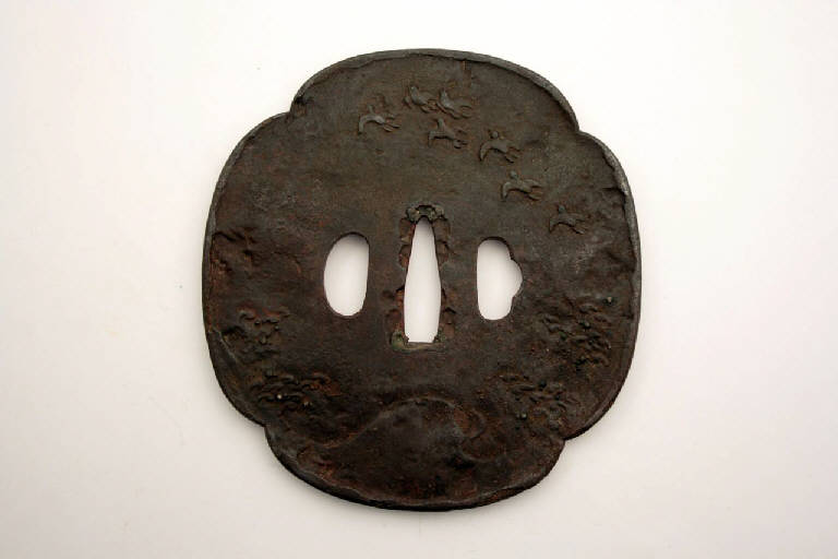 - NOTIZIE STORICO CRITICHE In Giappone l'elsa è detta "tsuba". La sua funzione primaria è quella di fare in modo che la mano di chi impugna la spada non finisca sulla propria lama, oltre a bilanciare la spada e a proteggere la mano dalla lama dell'avversario.\nIndirettamente, gli tsuba servivano anche a mostrare lo stato sociale e il gusto personale e, come per altri oggetti d'uso, divennero presto un mezzo d'espressione artistica.\nDal XIX secolo, quando la spada e i suoi accessori divennero più decorativi che funzionali, e ancor più dal 1878, a seguito della proibizione di portare la spada, gli tsuba erano prodotti come oggetti da collezione favoriti dagli occidentali, che li vedevano come una originale e nuova forma d'arte. Molti di questi oggetti raggiunsero infatti l'Europa già nell'Ottocento.\n\nLa gru è tra i più importanti simboli di longevità e buona fortuna. In arte è soprattutto legata al Nuovo Anno e ai matrimoni. Essa è anche emblema della nobiltà di corte e della famiglia imperiale.