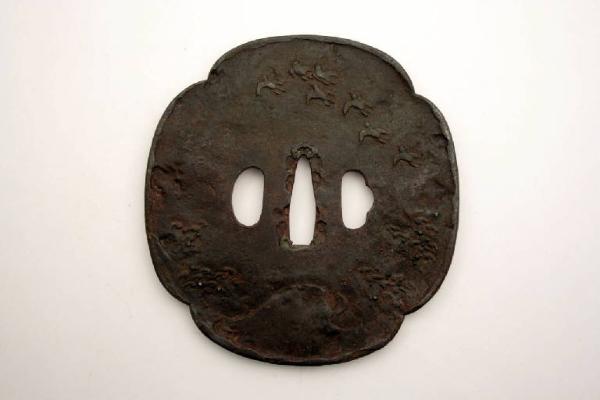 Elsa di spada giapponese di forma quadrilobata (mokko), con bordo rialzato e ripiegato sulla superficie, con i tre fori canonici, quello centrale (nakagoana) per il codolo, il foro di sinistra (kozuka hitsuana) per il coltellino, e quello di destra (kogai hitsuana) per lo spillone. La decorazione, a motivo di onde sopra le quali vola uno stormo di gru, è realizzata con intarsi in argento.