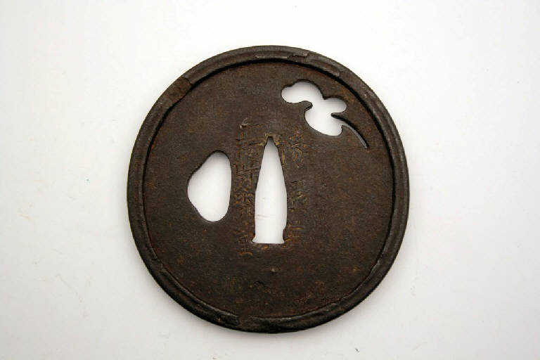 - NOTIZIE STORICO CRITICHE In Giappone l'elsa è detta "tsuba". La sua funzione primaria è quella di fare in modo che la mano di chi impugna la spada non finisca sulla propria lama, oltre a bilanciare la spada e a proteggere la mano dalla lama dell'avversario.\nIndirettamente, gli tsuba servivano anche a mostrare lo stato sociale e il gusto personale e, come per altri oggetti d'uso, divennero presto un mezzo d'espressione artistica.\nDal XIX secolo, quando la spada e i suoi accessori divennero più decorativi che funzionali, e ancor più dal 1878, a seguito della proibizione di portare la spada, gli tsuba erano prodotti come oggetti da collezione favoriti dagli occidentali, che li vedevano come una originale e nuova forma d'arte. Molti di questi oggetti raggiunsero infatti l'Europa già nell'Ottocento.\n\nQuesto tsuba è riconducibile al tipo Hirata.