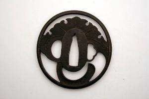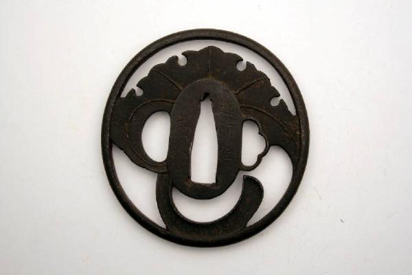 Elsa di spada giapponese di forma tonda. con i tre fori canonici, quello centrale (nakagoana) per il codolo, il foro di sinistra (kozuka hitsuana) per il coltellino, e quello di destra (kogai hitsuana) per lo spillone. La decorazione è realizzata a traforo e rappresentata una foglia.