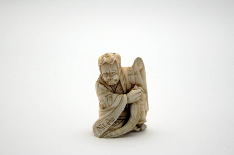 - NOTIZIE STORICO CRITICHE La parola okimono significa letteralmente "oggetto da posare" e può fare riferimento a statuette di varie dimensioni e materiali quali il bronzo, la porcellana, il legno e, come in questo caso, l'avorio. Si tratta a tutti gli effetti di un soprammobile, ma non viene considerato tale in quanto l'arredamento giapponese tradizionale non prevedeva l'esposizione di oggetti sopra tavolini o credenze, come d'uso in Occidente. Gli okimono erano posti solitamente sugli scaffali sfalsati o sul mobiletto che si trovava a fianco della nicchia detta "tokonoma" e, se particolarmente preziosi, erano posti direttamente nella nicchia, atta a ospitare il rotolo dipinto. In Giappone l'oggetto "da posare" non era esposto solo per la sua bellezza intrinseca, ma per il significato simbolico e benaugurale ad esso legato, ed era spesso mostrato in occasione di un evento o durante una particolare stagione.\n\nVerso la fine del periodo Edo la creazione di piccoli manufatti quali netsuke e okimono subì un notevole incremento. Talvolta essi erano molto piccoli e si distinguono dai netsuke soltanto per l'assenza dei fori obliqui che servivano per inserire il cordoncino di seta da sospendere alla cintura. Si trattava in molti casi di oggetti da regalo con significato benaugurale e talvolta di veri e propri souvenir per chi passava per la capitale.\nIn periodo Meiji, il collezionismo di okimono e netsuke era comune fra i viaggiatori occidentali presenti in Giappone per affari o diletto.