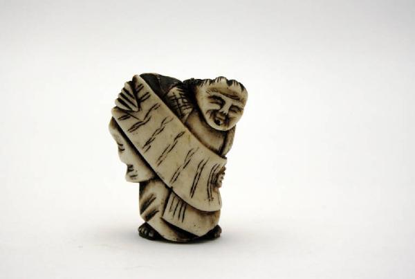 - NOTIZIE STORICO CRITICHE Il netsuke è un accessorio dell'abito tradizionale giapponese che permetteva di sospendere alla cintura una serie di oggetti quali l'astuccio per sigillo o per medicinali (inro), la borsa da tabacco e la pipa, il completo da scrittura (yatate), oppure il borsello o la bottiglietta per il profumo. Questi oggetti erano detti "koshisage" o "sagemono", cose sospese - ai fianchi. Essi erano legati a un cordoncino che passava per una piccola perla, lo "ojime", e infine al netsuke che fungeva da contrappeso e andava a fermarsi alla cintura. Il netsuke nasce infatti per permettere di sfilare gli oggetti dalla cintura senza doverli slegare e legare continuamente.\n\nL'uomo con le scritture buddiste in mano è definito da molti autori un sennin. In alcuni netsuke, il personaggio con rotolo aperto ha la testa allungata di Jurojin (Shoulao), patrono degli studiosi e divinità del pantheon dei "Sette dei della fortuna" (Shichi Fukujin). H. L. Joly, in Legends of Japanese Art, attribuisce una figura simile al sennin "Unkaku", divinità che non sembra appartenere a nessun pantheon giapponese. Alcuni studiosi talvolta fanno ancora riferimento a questa fonte. Unkaku, traducibile in "Gru fra le nuvole" si riferisce probabilmente all'immagine di Jurojin con il rotolo aperto di fronte a se' mentre è in volo sopra una gru, il'animale-veicolo tradizionalmente a lui associato, oltre al cervo.