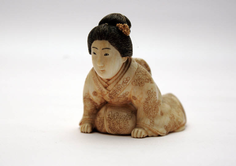 Statuetta, okimono (letteralmente: oggetto da posare), in avorio, raffigurante una dama nell'atto di inchinarsi a terra. La dama è riccamente agghindata, porta una elaborata acconciatura tradizionale con un crisantemo fra i capelli e indossa un pesante kimono con lunghe maniche, decorato con una moltitudine di crisantemi. La donna guarda di fronte a sé con un sorriso discreto .\nAlcuni dettagli, come le decorazioni del kimono o i capelli, sono colorati.