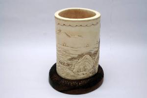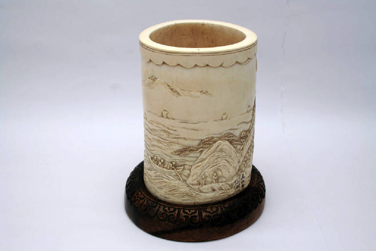 Sezione cava di zanna d'elefante intagliata e incastrata su una base di legno a formare un vaso. Sulla parete esterna è raffigurata a bassorilievo una montagna in prossimità di un lago o un mare con giunche all'orizzonte. Due personaggi attraversano un ponte vicino a un'abitazione sopra la quale si innalza una pagoda. Altre tre figure stanno raggiungendo la riva in barca. In lontananza si intravedono altre montagne. In alto nel cielo una falce di luna. L'avorio presenta zone gialle più scure e alcune spaccature. La base in legno è intagliata a corolla di petali stilizzati campiti da motivi a cuore.