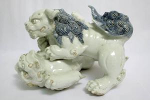 Statuetta (okimono) in porcellana bianca con particolari in blu sottovetrina rappresentante due leoncini cinesi (karashishi) che giocano. Quello più grande, con la criniera e la coda in blu, tiene sotto la zampa sinistra anteriore quello più piccolo, riverso a terra.
