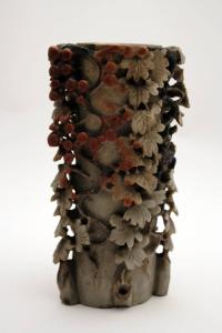 Vaso in pietra saponaria con decorazioni traforate di fiori e foglie. I fiori sono messi in risalto dalle sfumature particolari del materiale.