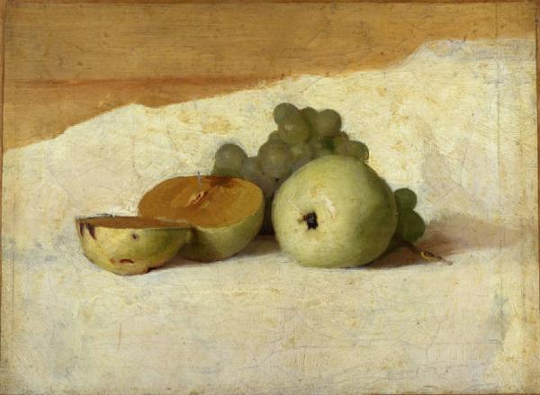 Dipinto a olio su tela di Giuseppe Pellizza da Volpedo di piccole dimensioni, raffigurante una mela intera, una tagliata e un grappolo d'uva verde, su un piano bianco.