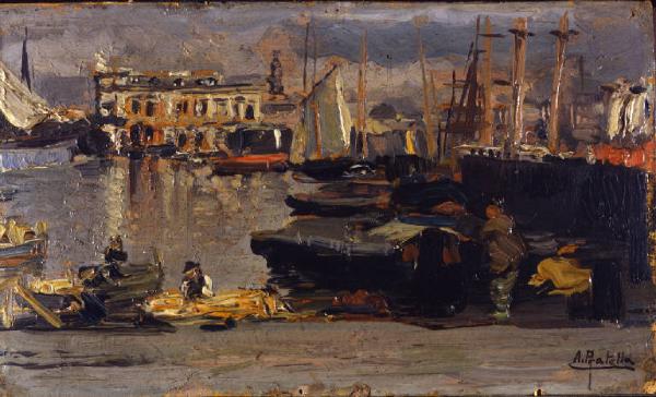 Dipinto a olio di piccole dimensioni di Attilio Pratella, montato in una cornice con soggetti analoghi, raffigurante una veduta del porto di Napoli, con il palazzo dell'Immacolatella sul fondo.