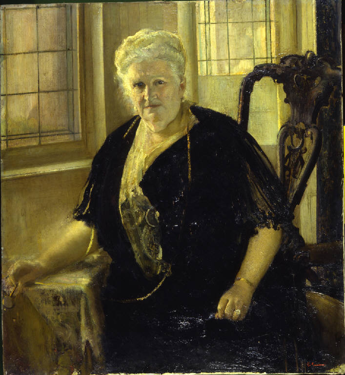 Dipinto a olio di medie dimensioni di Pietro Gaudenzi, raffigurante Erminia Albanese, suocera di Guido Rossi, seduta su una sedia\n d'epoca, in un interno domestico con due finestre. Rivolta verso lo spettatore, indossa un abito nero e tiene nella mano destra un paio di occhiali.