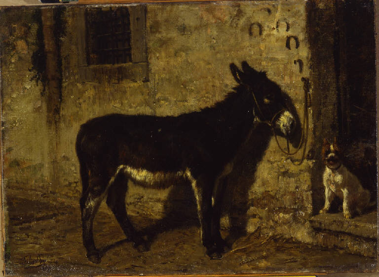Dipinto a olio di medie dimensioni di Filippo Palizzi, raffigurante un asino di profilo all'aperto legato presso una porta, sulla cui soglia è piccolo cane, rivolto verso il riguardante.