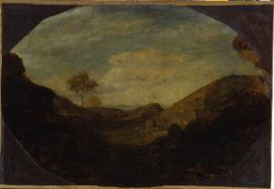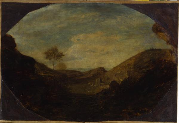 Dipinto a olio di piccole dimensioni di Antonio Fontanesi, raffigurante un paesaggio con basse montagne, entro un ovale.