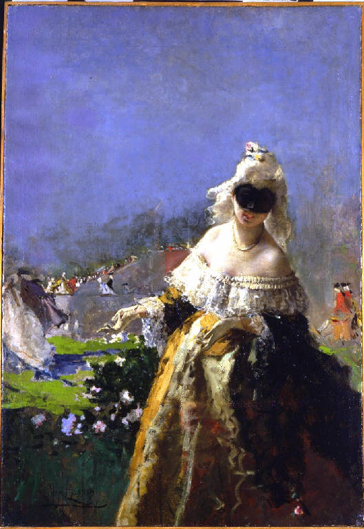 Dipinto a olio di medie dimensioni di Mosè Bianchi, raffigurante una giovane donna mascherata, in abiti settecenteschi, rivolta verso il riguardante, a cui indica l'ambiente retrostante.
