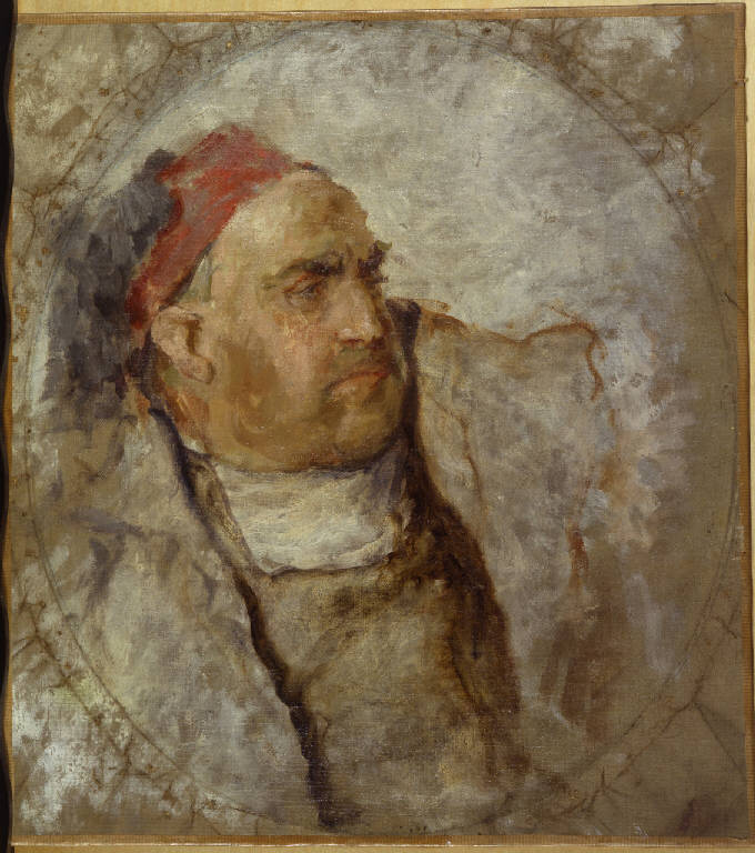Dipinto a olio di medie dimensioni di Mosè Bianchi, inscritto in un ovale, raffigurante un uomo di mezza età a mezzobusto: il volto di tre quarti è rivolto verso destra e indossa un berretto rosso con decorazione nera e una colletto bianco.