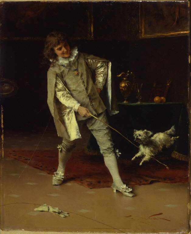 Dipinto a olio di piccole dimensioni di Francesco Vinea, raffigurante un giovane in in piedi in abiti seicenteschi che fa saltare un piccolo cane bianco, in un interno domestico d'epoca.