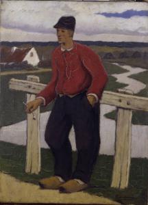 Dipinto di medie dimensioni di Eugène Laermans, raffigurante un uomo a figura intera con indosso una giacca rossa, pantaloni neri e zoccali, che fuma la pipa appoggiato auna staccionata.
