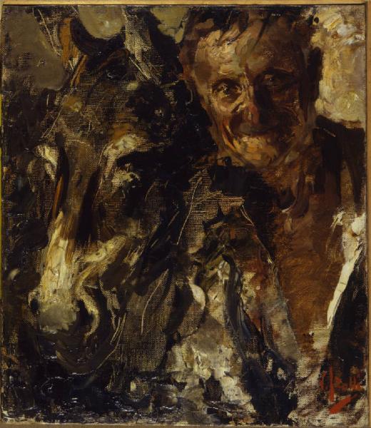 Dipinto a olio di medie dimensioni di Vincenzo Irolli, raffigurante un asino e un uomo anziano a mezzobusto, rivolti verso il riguardante.
