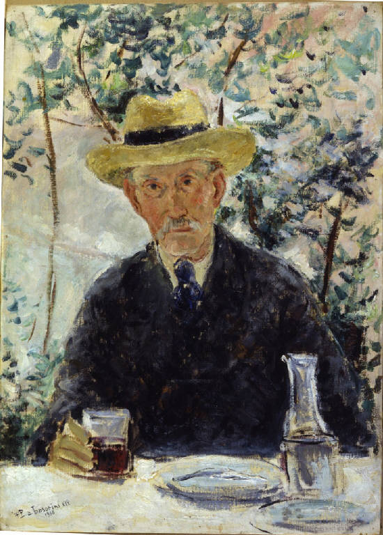 Dipinto a olio di medie dimensioni di Pierangelo Basorini, raffigurante un uomo anziano con completo scuro e capello di paglia a mezzo busto, seduto ad un tavolo all'aperto con un bicchiere di vino nella mano destra.