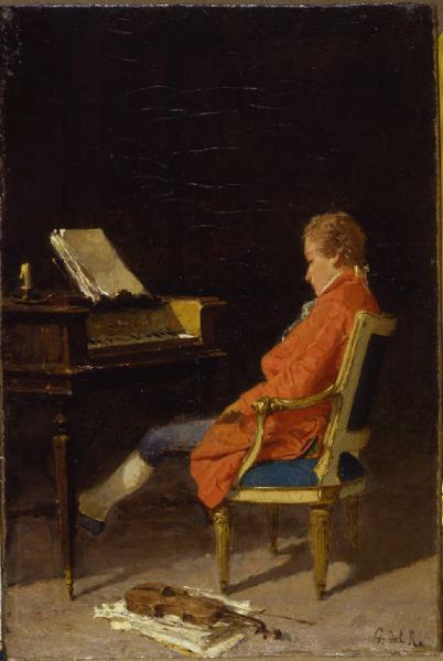 Dipinto a olio di piccole dimensioni di Giovanni Dal Re, raffigurante Mozart di profilo, seduto su una sedia intagliata e dorata, in un interno domestico, davanti al pianoforte.