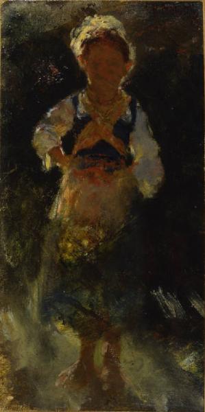 Dipinto a olio di piccole dimensioni rdi Francesco Paolo Michetti, raffigurante una giovane contadina in piedi a figura intera, rivolta verso il riguardante.