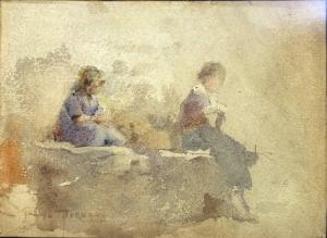 Acquerello di piccole dimensioni di Vespasiano Bignami, raffigurante due bambino sedute a breve distanza l'una dall'altra, girate verso destra.