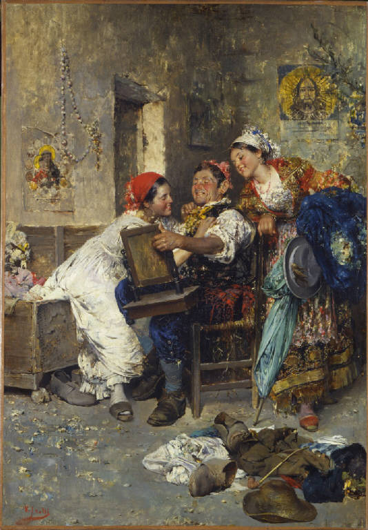 Dipinto a olio di piccole dimensioni di Vincenzo Irolli, raffigurante un uomo seduto che si guarda allo specchio, con accanto due donne in piedi rivolte verso di lui, in un interno domestico.