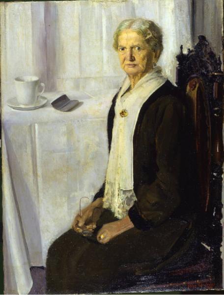 Dipinto a olio di medie dimensioni di Pietro Gaudenzi, raffigurante Luisa Scandroglio Rossi, madre di Guido Rossi, seduta su una sedie d'epoca, in un interno domestico, davanti aun tavolo coperto da una tovaglia bianca. Seduta di profilo verso sinistra, volge la testa verso il riguardante, indossa un abito nero e tiene nella mano destra un paio di occhiali.
